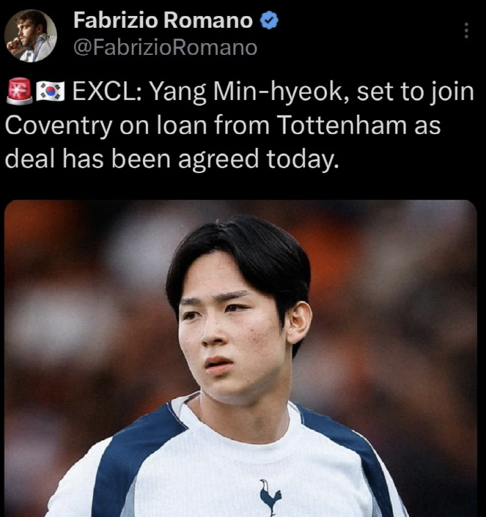유럽축구 이적시장 전문가 파브리치오 로마노 기자는 6일(한국시각) 단독 보도를 통해 '양민혁이 토트넘에서 코벤트리 시티로 가는 임대가 확정됐다'고 전했다.