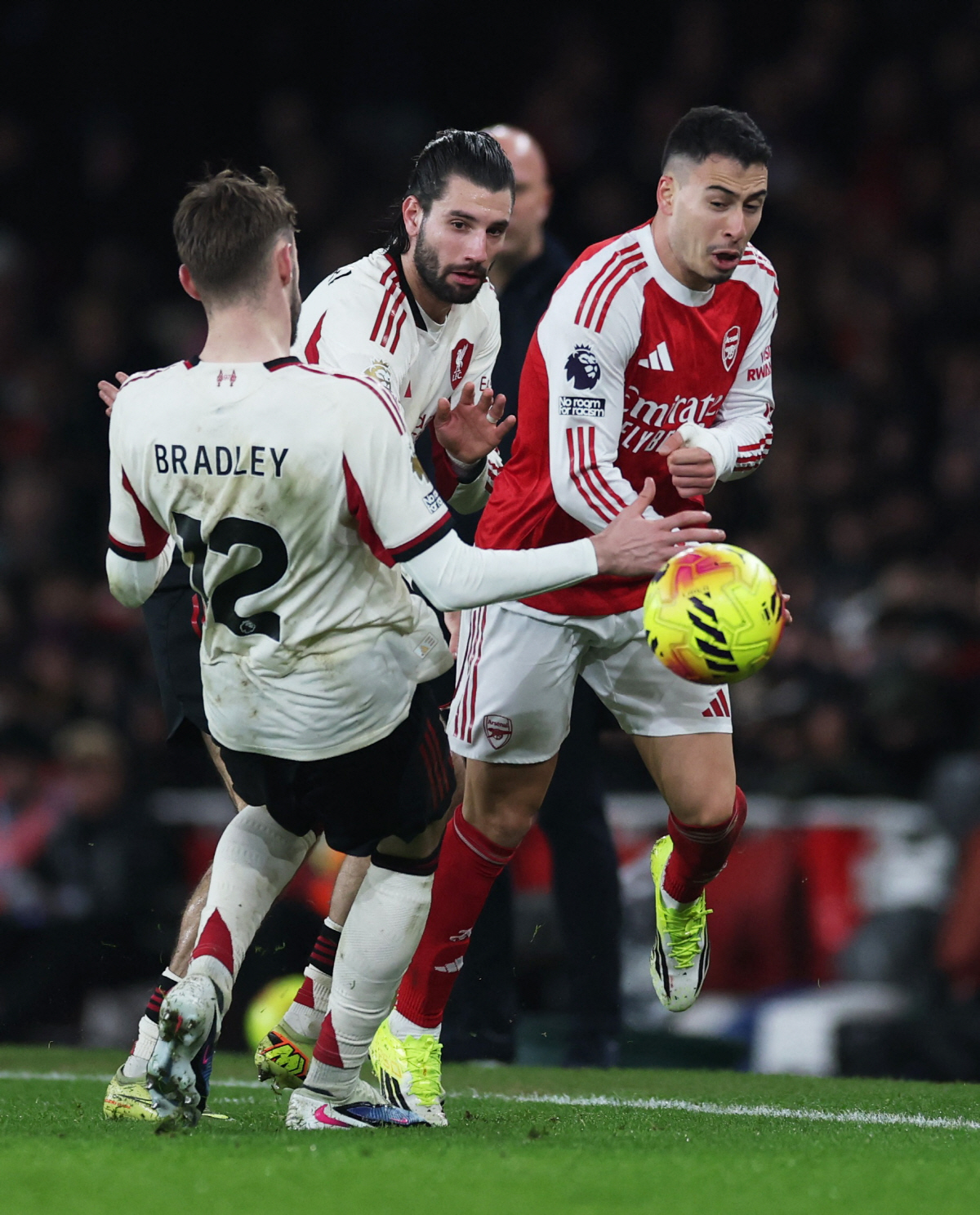 Soccer Football - Premier League - Arsenal v Liverpool - Emirates Stadium, London, Britain - January 8, 2026 Liverpool's Conor Bradley and Dominik Szoboszlai in action with Arsenal's Gabriel Martinelli Action Images via Reuters/Paul Childs EDITORIAL USE ONLY. NO USE WITH UNAUTHORIZED AUDIO, VIDEO, DATA, FIXTURE LISTS, CLUB/LEAGUE LOGOS OR 'LIVE' SERVICES. ONLINE IN-MATCH USE LIMITED TO 120 IMAGES, NO VIDEO EMULATION. NO USE IN BETTING, GAMES OR SINGLE CLUB/LEAGUE/PLAYER PUBLICATIONS. PLEASE CONTACT YOUR ACCOUNT REPRESENTATIVE FOR FURTHER DETAILS..<저작권자(c) 연합뉴스, 무단 전재-재배포, AI 학습 및 활용 금지>