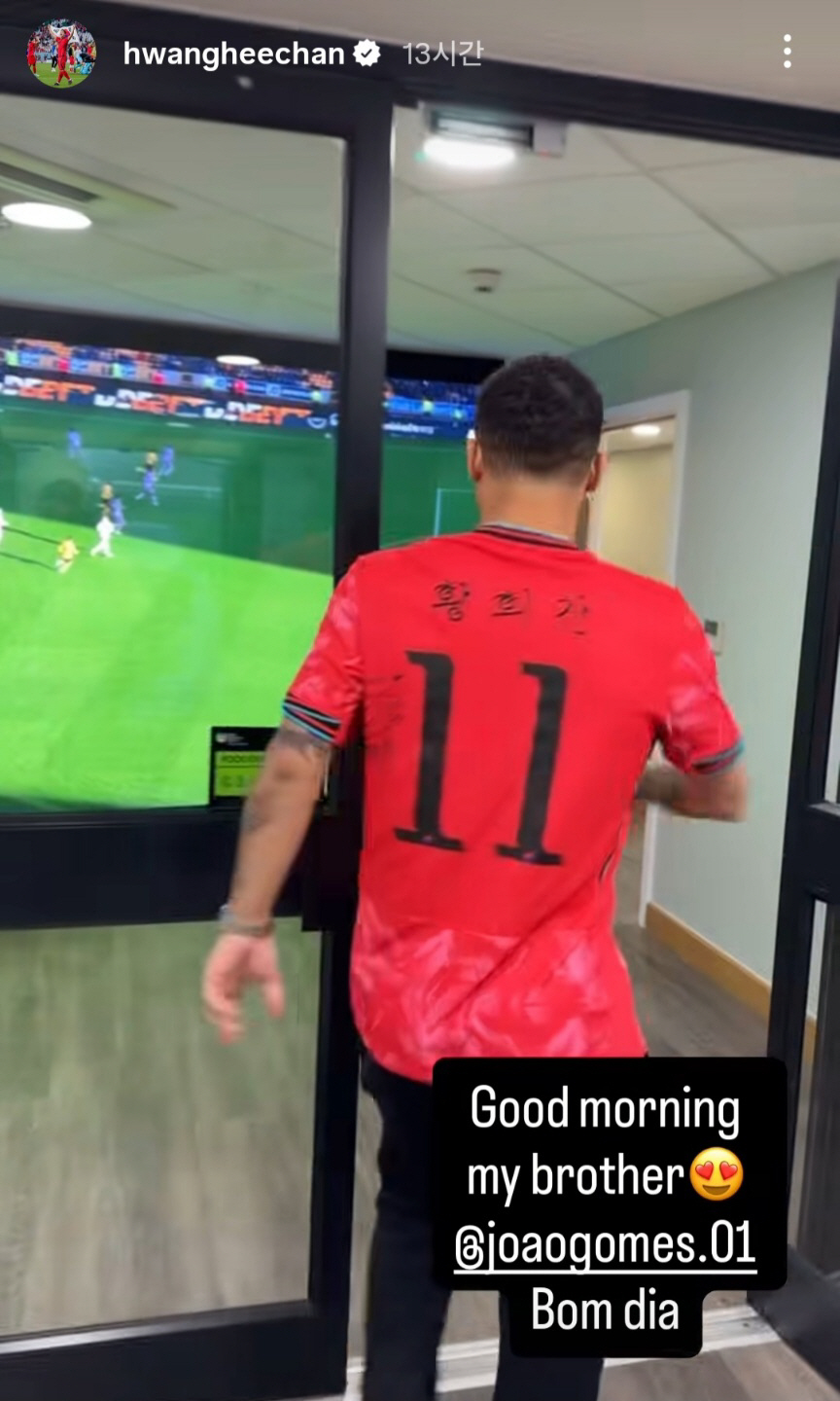 황희찬은 13일(한국시각) 개인 SNS를 통해서 울버햄튼 동료이자 브라질 국가대표인 주앙 고메스의 근황을 전했다. 고메스는 아침에 울버햄튼 훈련장으로 출근할 때 황희찬의 대한민국 국가대표팀 유니폼을 입고 등장했다. 황희찬의 이름이 한글로 적혀있는 대한민국 국가대표팀 등번호 11번 유니폼이었다. 황희찬이 고메스에게 선물해준 유니폼으로 추정된다. 황희찬은 "굿모닝, 내 형제. 좋은 아침이야"라고 적었다.