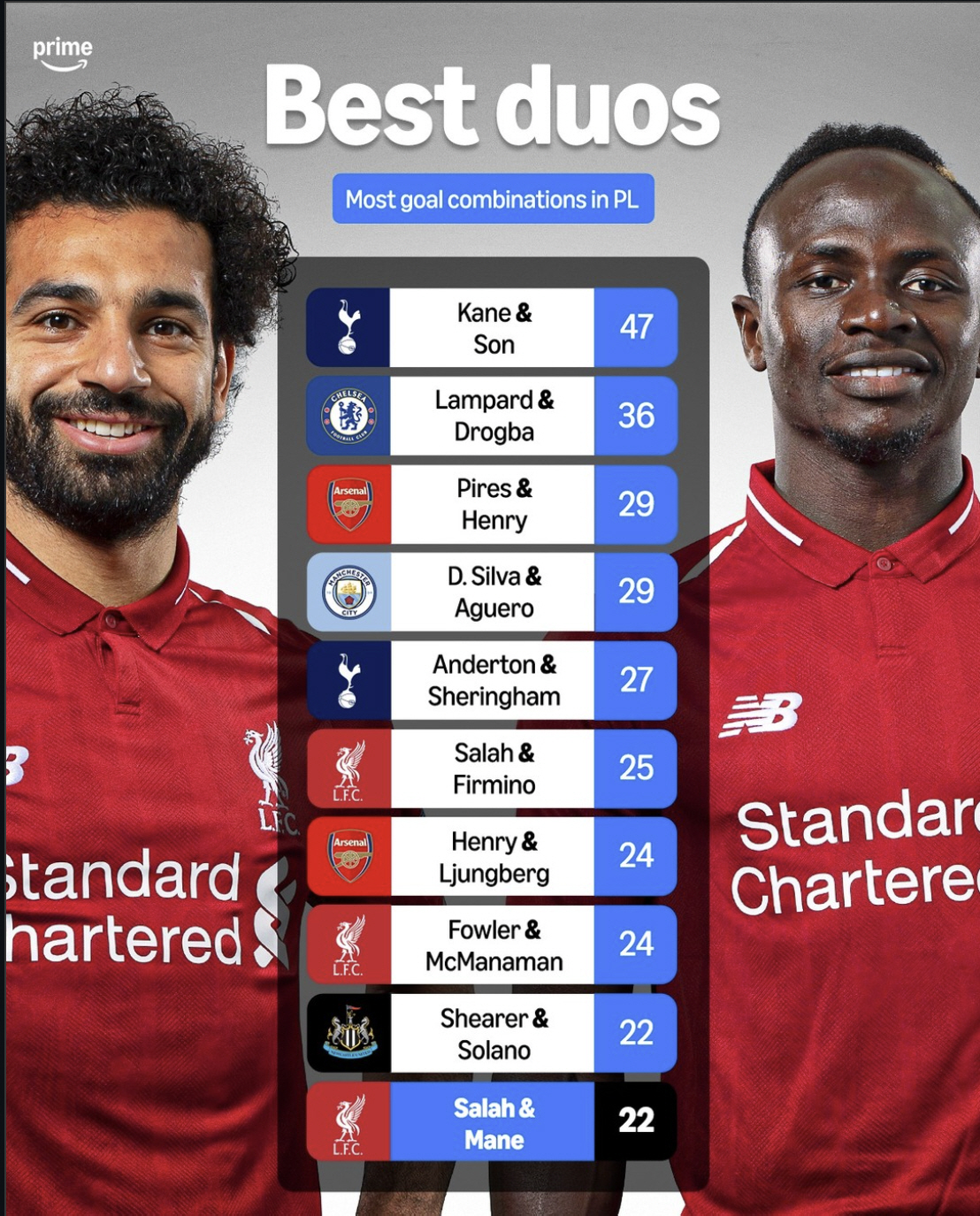 살라와 마네는 2017년 여름에 살라가 리버풀로 이적하면서 함께 호흡했다. 마네가 2022년 여름 바이에른 뮌헨으로 이적하기 전까지 6년을 동료로서 보냈다. 리그에서 6시즌 동안 뛰면서 두 선수는 22골을 리그에서 합작했다. 두 선수의 기록은 현역 선수 기준 EPL 역대 합작골 듀오 3위에 해당하는 대기록이다. 역대로 보면 전체 10위다. 매우 높다.
