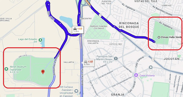 홍명보호가 베이스캠프로 확정한 치바스 베르데 바예와 월드컵 조별리그 1~2차전을 치를 에스타디오 아크론까지는 차량으로 10분 남짓 걸린다.