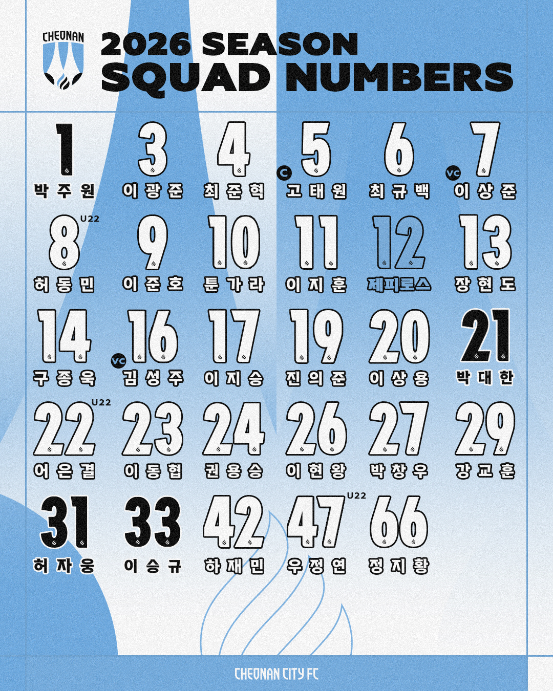 천안은 평균 연령 26.7세로, 지난 시즌 대비 약 2세 젊어진 스쿼드로 새 시즌을 맞는다. 팀의 구심점을 맡을 2026시즌 주장단 배번도 확정됐다. 새롭게 천안의 주장을 맡은 고태원은 5번, 부주장 김성주 16번, 이상준 7번을 부여받았다.
