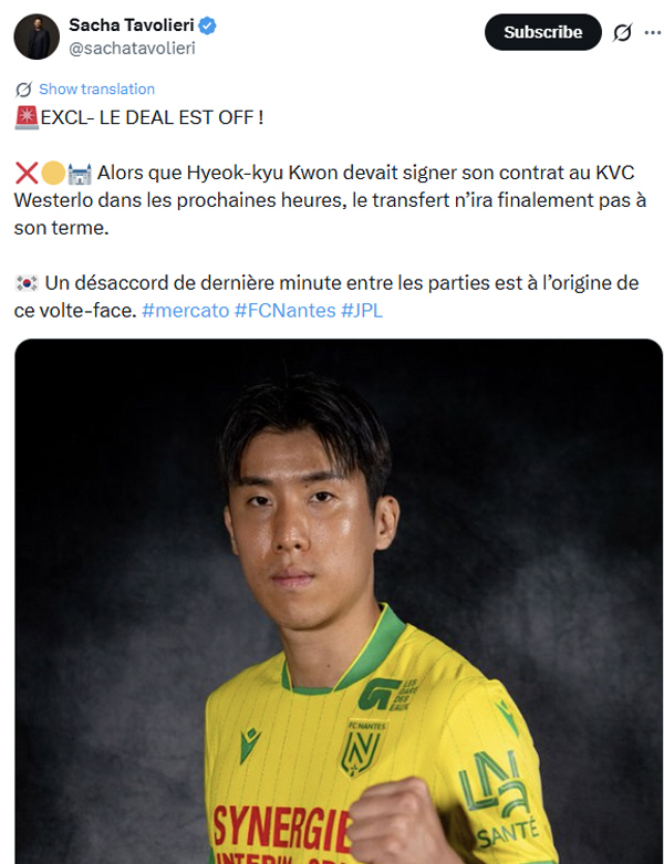 하지만 약 5시간 뒤 다시 이번엔 이적 불발 소식을 다뤘다. 타볼리에리는 "권혁규는 몇 시간 안에 베스테를로와 계약을 체결할 것으로 예상됐지만, 결국 이적이 무산됐다"라고 했다.