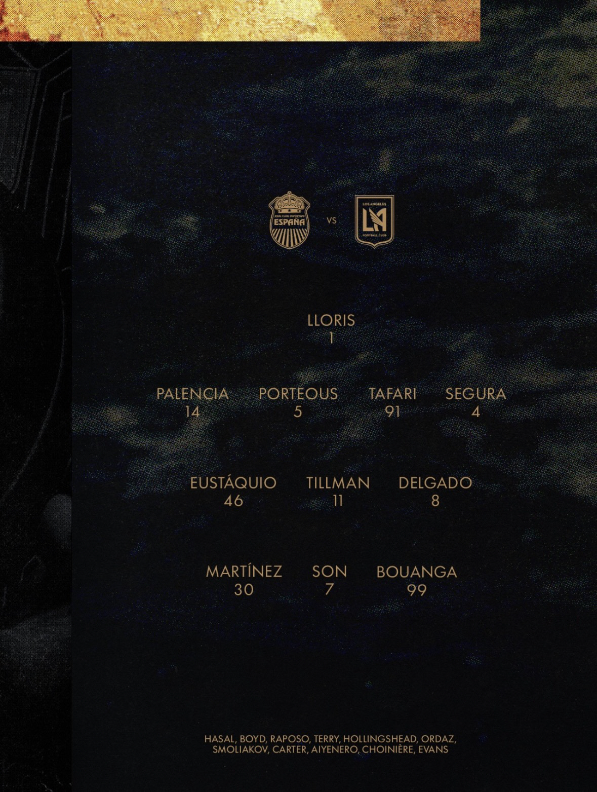 손흥민은 레알 에스파냐전에서 선발로 나선다. 당초 22일 LA 메모리얼 콜리세움에서 열리는 '디펜딩챔피언'인 리오넬 메시의 인터 마이애미와의 2026년 MLS 개막전이 예정된만큼, 무리하게 나서지 않을수도 있다는 가능성도 제기됐지만, 산토스 감독은 최정예 카드를 꺼냈다.