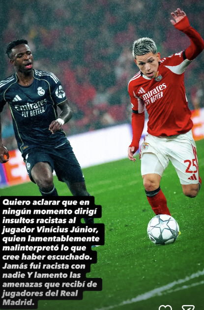 [스포츠조선 노주환 기자]레알 마드리드 스타 비니시우스 주니오르에게 인종차별적 발언을 한 혐의로 받고 있는 아르헨티나 출신 벤피카 프레스티아니가 자신의 입장을 밝혔다.