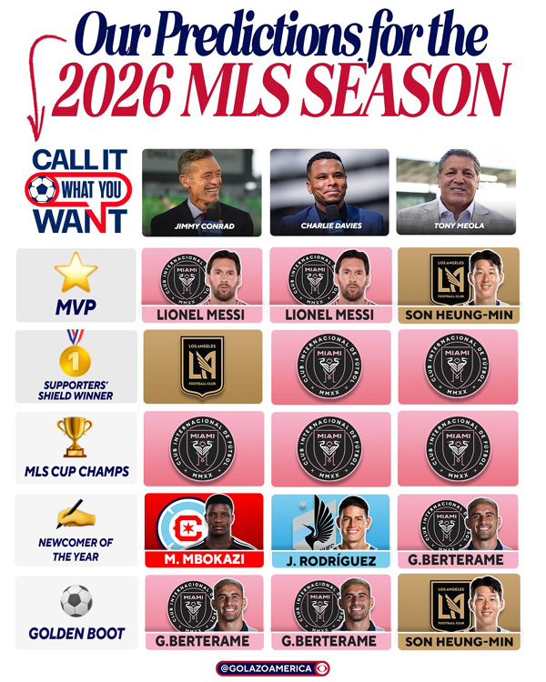 미국 스포츠매체 'CBS스포츠'는 21일(한국시각), 미국 대표 출신 방송인 3인의 시즌 예측을 공개했다. 골키퍼 출신 토니 메올라, 수비수 출신 지미 콘래드, 공격수 출신 찰리 데이비스는 개막이 임박한 2026년 미국프로축구(MLS)의 우승팀, 서포터즈 실드 우승팀, 시즌 최우수선수(MVP), 득점왕, 신인상 등을 예측했다.