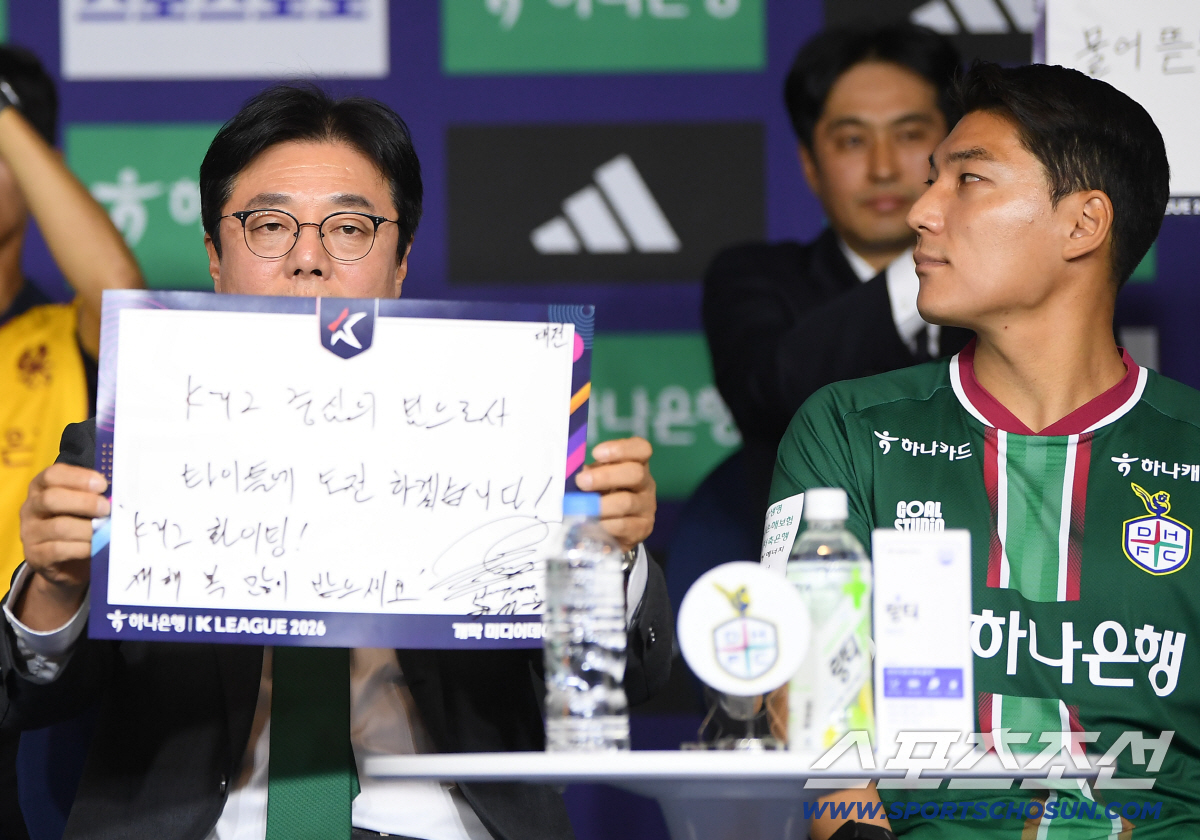 하나은행 K리그1 2026 개막 미디어데이가 25일 오전 서울 홍은동 스위스그랜드호텔 컨벤션센터에서 열렸다. 대전 황선홍 감독이 출사표를 들고 있다. 정재근 기자 cjg@sportschosun.com/2026.2.25/