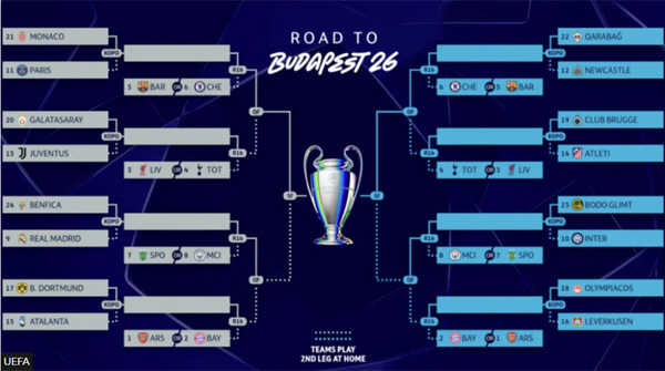 앞서 아스널(잉글랜드), 바이에른뮌헨(독일), 리버풀, 토트넘(이상 잉글랜드), 바르셀로나(스페인), 첼시(잉글랜드), 스포르팅(포르투갈), 맨시티(잉글랜드) 등은 리그 페이즈에서 1~8위를 기록하며 16강에 직행했다.
