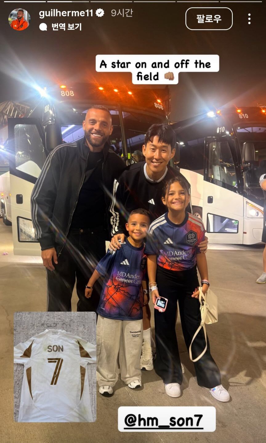 적으로서 손흥민이 미울 수밖에 없는 경기. 하지만 휴스턴 공격수인 길례르미는 참지 못했다. 휴스턴 공격수인 길례르미는 경기 후 개인 SNS에 손흥민과의 인증샷을 찍은 가족사진을 공유하면서 "경기장 안팎의 스타"라는 말을 달았다. 길례르미는 아들과 딸을 불러서 손흥민과 기념사진을 촬영하게 했다. 아들과 딸만 불러서 손흥민과 찍은 사진, 자신이 손흥민과 포옹하고 있는 사진, 손흥민이 아이들과 대화를 하는 사진까지 올리면서 손흥민과의 추억을 자랑했다.