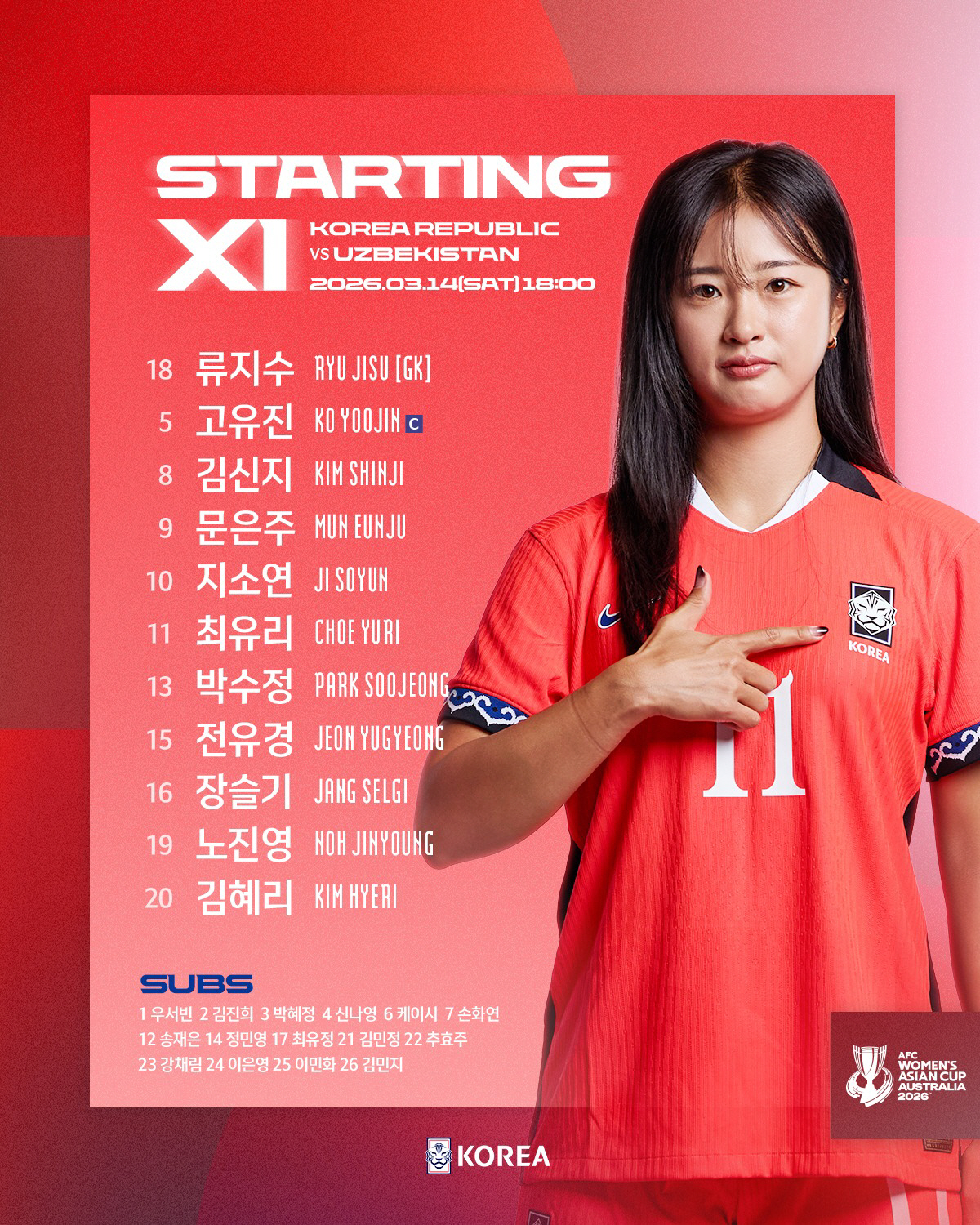 한국은 14일 오후 6시(한국시각) 호주 시드니의 스타디움 오스트레일리아에서 우즈베키스탄과 2026년 아시아축구연맹(AFC) 여자 아시안컵 8강전 경기를 벌인다.
