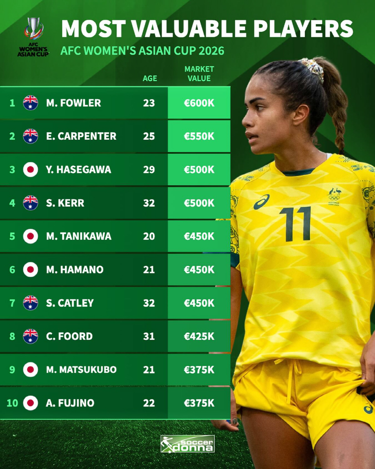 일본의 자신감은 선수단의 격차에서도 드러난다. 글로벌 여자축구 콘텐츠 매체인 사커도나는 '여자 아시안컵에 참가하는 선수 중 시장가치가 높은 선수들'이라며 총 10명의 명단을 공개했다. 헤당 명단에는 5명의 호주 선수와 5명의 일본 선수만이 이름을 올렸다. 한국 선수의 이름은 없었다.