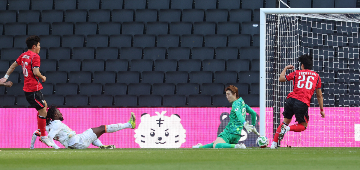 추가 실점 상황도 크게 다르지 않았다. 선제실점 후 기세는 완전히 코트디부아르쪽으로 넘어갔다. 38분 세리의 중거리 슛과 39분 코너킥 상황에서 아그바두의 헤더는 조현우가 잇달아 선방했다. 42분 공격에 가담한 설영우의 오른발 감아차기 슛은 우측 골대를 때렸다. 전반 추가시간 1분 한국은 추가실점을 내줬다. 한국 진영 왼쪽 하프스페이스에서 전진패스를 잡은 아딩라가 영리한 턴 동작으로 조유민을 가볍게 벗겨낸 후 조현우의 선방을 피해 골문 우측 구석을 찌르는 오른발 슛으로 골망을 흔들었다.