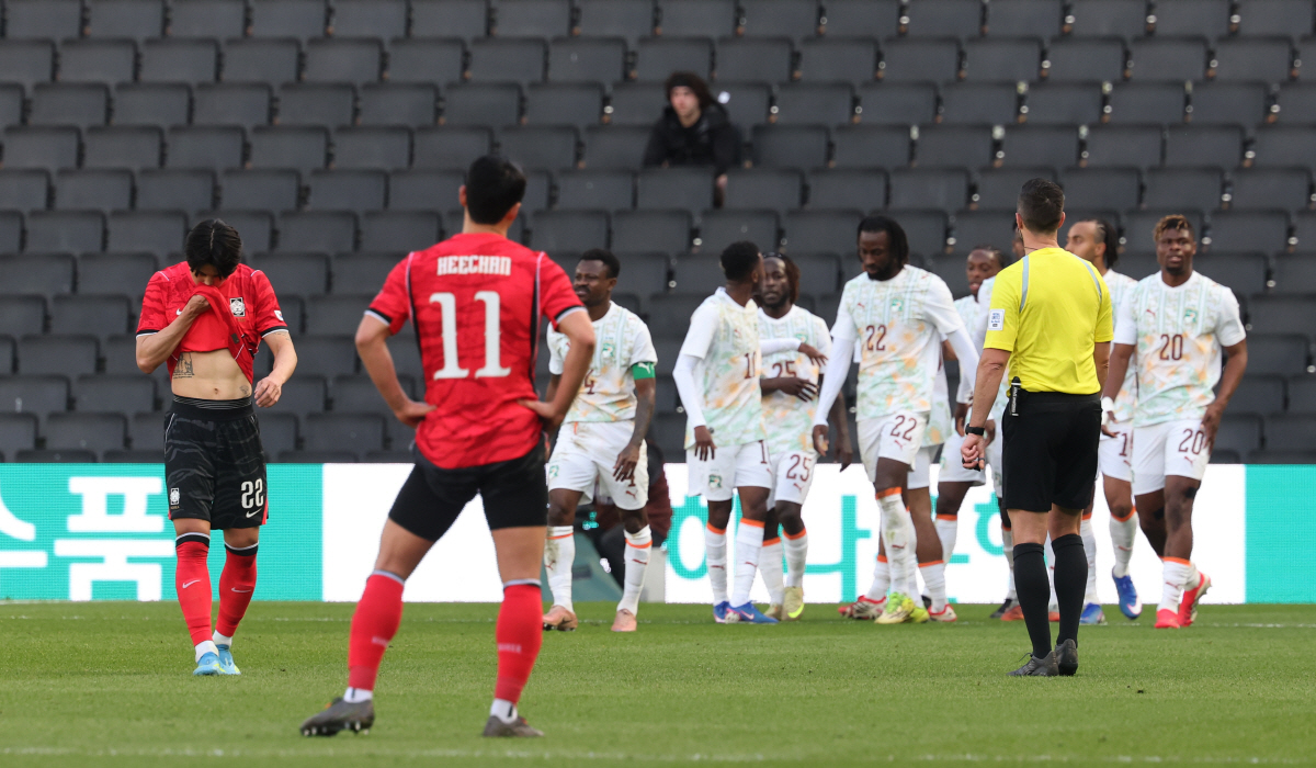 아쉬워 하는 한국 (밀턴킨스[영국]=연합뉴스) 최재구 기자 = 한국축구국가대표팀이 28일(현지시간) 영국 밀턴킨스 스타디움 MK에서 열린 코트디부아르와 평가전에서 두번째 실점을 아쉬워하고 있다. 2026.3.29 jjaeck9@yna.co.kr (끝)