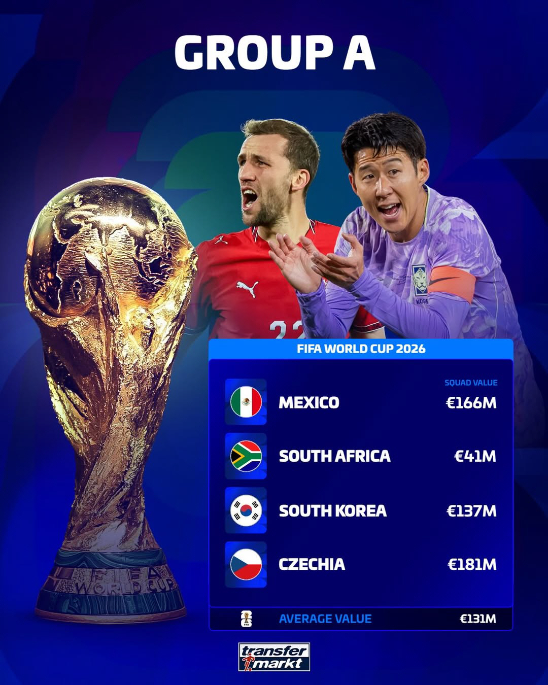 월드컵은 '쩐의 전쟁'이다. '몸값'도 관심이다. 축구 이적시장 전문매체인 '트랜스퍼마크트'는 2일(한국시각) 월드컵 진출국의 선수단 몸값(3월 A매치 소집 명단 기준)을 조별로 분류해 발표했다. A조 최강은 조 1위 가능성이 가장 높은 것으로 예상되는 멕시코가 아니었다. '호화 군단' 덴마크를 꺾는 이변으로 20년 만의 월드컵 진출에 성공한 체코였다.