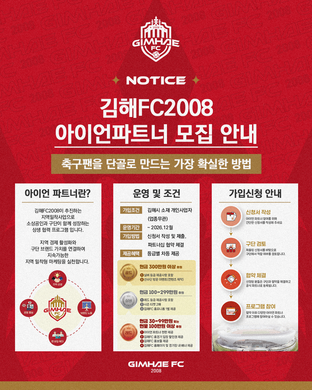 [스포츠조선 노주환 기자]2026시즌부터 K리그2(2부)에 참가하고 있는 김해FC가 지역 상생 및 경제 활성화를 위한 프로젝트의 일환으로 소상공인과 구단이 함께 성장하는 상생 협력 프로그램 '아이언 파트너'를 모집한다. 아이언 파트너는 자영업자와의 소규모 협약을 통해 김해FC 홍보와 경제 활성화를 도모하고자 기획됐다. 현금(30만원~300만원 이상) 또는 현물(100만원 이상) 후원 시 등급별 맞춤형 혜택을 제공하는 파트너십 제도다.