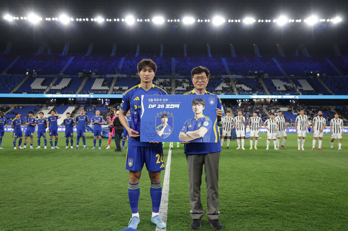 울산은 15일 열린 FC서울과의 '하나은행 2026 K리그1' 2라운드 순연경기 킥오프에 앞서 HD현대 임원후원회가 수여하는 '이달의 선수' 시상식을 진행했다. 이날 시상한 '3월의 선수'에는 왼쪽 수비에서 투혼 넘치는 플레이와 활발한 전진 플레이로 팀에 활력을 불어넣은 조현택이 선정됐다.