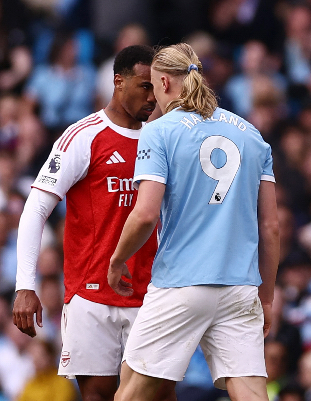 경기 전부터 사실상의 우승 결정전이라고 회자됐다. 이겨야 사는 중대한 일전, 이날 90분 내내 '노르웨이 국대' 홀란과 '브라질 국대' 마갈량이스는 끊임없이 충돌했다. 홀란의 골 직후 몸 싸움은 더욱 격렬해졌다. 마갈량이스가 홀란을 막아서기 위해 어깨를 타고 오르고 유니폼을 잡아당기는 등 갖은 노력을 다했고 이 과정에서 홀란의 이너 티셔츠가 가브리엘에 의해 찢어져 유니폼 밖으로 빠져나와 유니폼을 갈아입는 드문 상황도 발생했다. 두 선수의 치열한 신경전은 경기 막판까지 이어졌고 홀란이 가브리엘을 뿌리치는 또 한번의 격렬한 신체적 접촉 이후 평정심을 잃은 가브리엘이 홀란을 향해 덤벼들며 박치기를 하려는 듯한 동작을 취했다. 벤치 클리어링처럼 양팀 선수들이 일거에 몰려들어 뜯어말리는 장면까지 나왔다. 자칫 폭력적 행위로 인한 3경기 출전정지 징계로 이어질 수 있었던 아찔한 순간이었다. VAR은 가브리엘이 과도한 힘을 사용하지 않았다고 판정했고 홀란도 과한 '할리우드' 액션을 취하지 않았다. 경기 직후 홀란은 만약 자신이 더 극적인 반응을 보였더라면 결과가 매우 달라졌을 것이라고 주장했다.