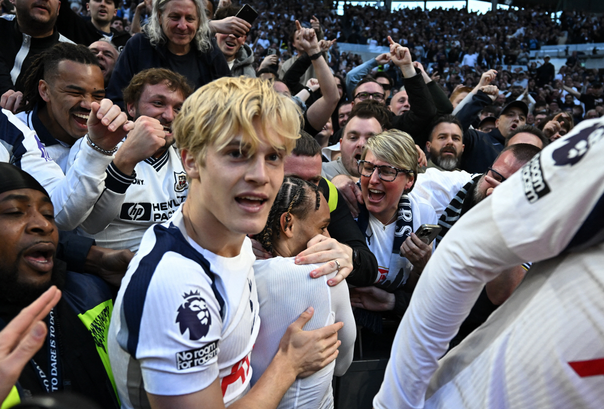 Soccer Football - Premier League - Tottenham Hotspur v Brighton & Hove Albion - Tottenham Hotspur Stadium, London, Britain - April 18, 2026 Tottenham Hotspur's Xavi Simons celebrates scoring their second goal with the fans and Lucas Bergvall REUTERS/Dylan Martinez EDITORIAL USE ONLY. NO USE WITH UNAUTHORIZED AUDIO, VIDEO, DATA, FIXTURE LISTS, CLUB/LEAGUE LOGOS OR 'LIVE' SERVICES. ONLINE IN-MATCH USE LIMITED TO 120 IMAGES, NO VIDEO EMULATION. NO USE IN BETTING, GAMES OR SINGLE CLUB/LEAGUE/PLAYER PUBLICATIONS. PLEASE CONTACT YOUR ACCOUNT REPRESENTATIVE FOR FURTHER DETAILS..