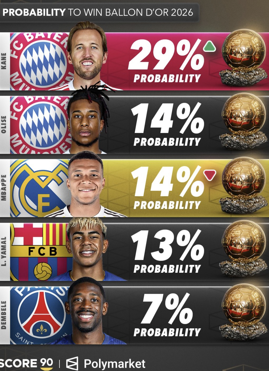 발롱도르 1순위로 꼽힌다. Score90 외에도 각종 매체에서 케인을 발롱도르 최우선 순위로 꼽고 있다. 바이에른은 이미 리그 우승을 차지한 상황, 케인은 유럽챔피언스리그 준결승에 올랐기에 우승까지 기세를 이어간다면 발롱도르에 미리 자신의 이름을 새겨둘 수 있을 가능성이 크다.