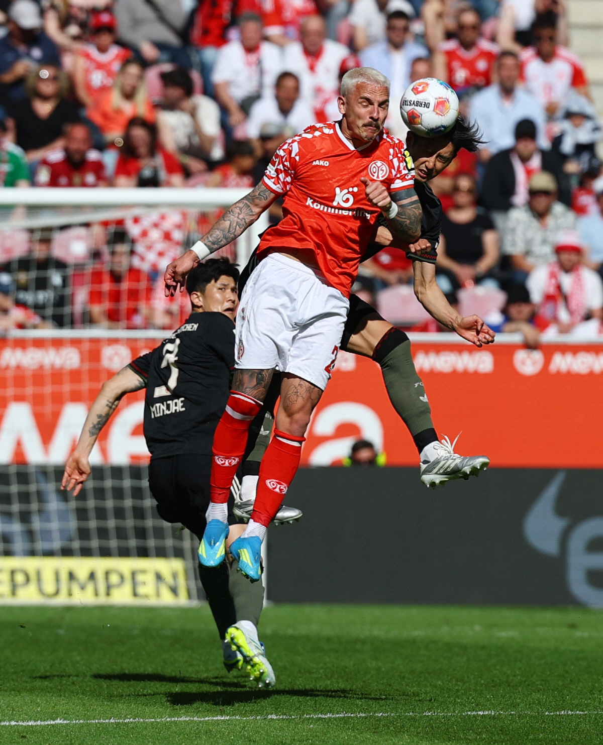 한편, 경기는 극적인 양상으로 전개됐다. 바이에른은 전반 15분 선제골을 내줬다. 사노 가이슈의 크로스를 도미니크 코어가 발리 슈팅으로 마무리했다. 29분 또 다시 한골을 내줬다. 속공 상황에서 나딤 아미리의 슈팅이 김민재를 맞고 나오자, 파울 네벨이 뛰어들며 득점으로 연결했다. 세번째 골까지 터졌다. 추가시간 아미리가 감아찬 슈팅이 골키퍼 맞고 나오자 셰랄도 베커르가 밀어넣었다. 전반은 마인츠의 0-3 리드로 끝이 났다.