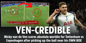 토트넘은 4일 오후(현지시각) 영국 런던 토트넘 홋스퍼 스타디움에서 열린 FC 코펜하겐과의 2025~2026시즌 유럽챔피언스리그(UCL) 리그페이즈 4라운드 경기에서 4대0으로 승리했다. 판 더 벤은 2-0으로 앞서고 있던 후반 19분 80m를 혼자 드리블한 후 골을 넣었다. 흡사 2019년 12월 번리를 상대로 80미터 드리블 후 골을 넣은 손흥민과 같았다. 손흥민은 그 시즌 국제축구연맹(FIFA) 푸스카스상을 수상했다.