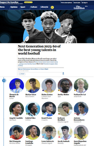 [스포츠조선 윤진만 기자]영국 일간 '가디언'이 2025년 축구 유망주를 발표했다. 대한민국 기대주의 이름은 아쉽게도 없었다.
