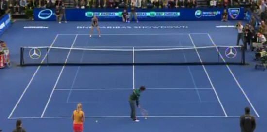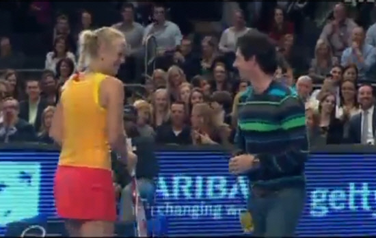 상황은 이렇다. 경기 중 샤라포파가 한 중년 남성 관중을 코트로 불러내 춤을 췄다. 다음은 워즈니아키의 차례. 워즈니아키는 관중석을 향해 "나랑 함께 춤을 출 분 없나요?"라고 물었고 관중석에 앉아 있던 남자친구 매킬로이는 두 손을 들었다. 그러나 매킬로이는 여자친구의 손이 아닌 테니스 라켓을 잡아야 했다. 라켓을 건네며 경기에 나설 것을 종용한 여자친구의 짓궂은 장난이었다. 젊은 신세대 답게 거리낌은 없었다. 매킬로이는 테니스 공을 코트에 놓고 라켓으로 골프를 치는 흉내를 내더니 곧 깜짝 대결에 임했다. 매킬로이는 8번의 랠리 끝에 샤라포바의 키를 넘기는 로빙 샷으로 샤라포바의 범실을 유도했다. 물론 한 수 접어준 샤라포바는 여유롭게 웃었다. 팬들은 박수로 환호했다.