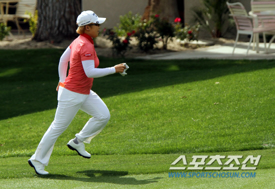 신지애(미래에셋)가 29일(한국시각) 미국 캘리포니아주 란초 미라지의 미션 힐스 골프장에서 벌어진 LPGA 투어 시즌 첫 메이저 크래프트 나비스코 챔피언십 프로암 도중 6번 홀을 마친 뒤 누군가를 알아보고는 비호(?)처럼 달려가고 있다. 란초 미라지(미 캘리포니아주)=이사부 기자 golf@sportschosun.com