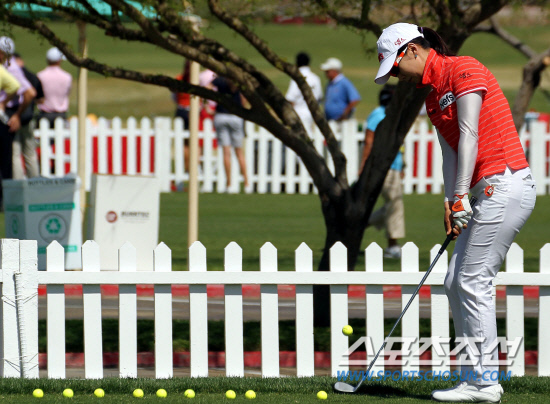 배경은(넵스)이 28일(한국시각) LPGA 투어 시즌 첫 메이저 대회인 크래프트 나비스코 챔피언십 개막을 앞두고 미국 캘리포니아주 란초 미라지의 미션 힐스 골프장에서 일렬로 공을 세운 뒤 칩샷을 훈련하고 있다. 란초 미라지(미 캘리포니아주)=이사부 기자 golf@sportschosun.com