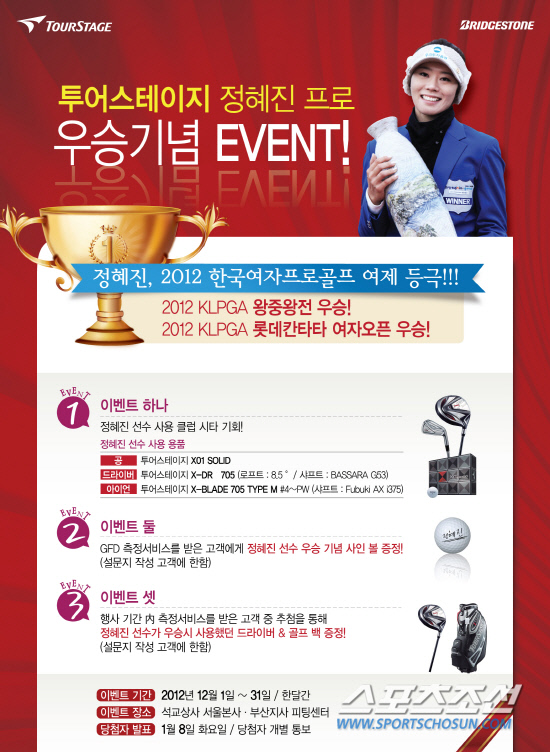 일본 골프 브랜드 '투어스테이지'를 수입, 판매하는 (주)석교상사가 한양수자인·솔라시도 2012 한국여자프로골프 왕중왕에서 소속 선수인 정혜진의 우승을 기념해 이벤트를 실시한다. 12월 한달간 진행되는 이벤트는 투어스테이지 피팅센터(서울/부산)를 방문해 GFD 측정서비스에 참여하는 고객을 대상으로 정혜진의 우승 클럽을 시타해 볼 수 있는 기회가 주어진다. 참여 고객에겐 정혜진의 우승 사인볼이 증정된다. 행사기간 내 참여고객을 대상으로 추첨을 통해 정혜진의 우승 드라이버와 골프백을 증정한다. 이벤트의 자세한 내용과 당첨자 발표는 석교상사 홈페이지(www.bsgolf.co.kr)를 통해 확인할 수 있다.