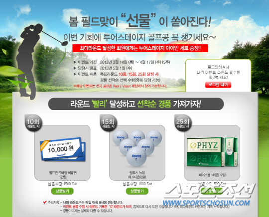 토털골프문화기업 골프존은 봄을 맞아 '라운드 미션 이벤트'를 오는 4월17일까지 실시한다. 이벤트 참여방법은 골프존 비전 및 리얼 시스템이 설치된 전국 스크린골프 매장에서 로그인 라운드 시 목표 라운드 10회, 15회, 25회 라운드를 달성하면 선착순으로 골프공, 골프존 모바일 이용권 등 푸짐한 선물이 제공된다. 또 이벤트 기간 동안 최다 라운드 30위 안에 든 회원에게는 투어스테이지 아이언 세트를 비롯한 보너스 경품이 주어진다. 이 외에도 추첨을 통해 캐디백 세트 등을 증정한다. 이와 함께 골프존은 필드에서 사용하는 볼을 스크린에서도 즐길 수 있는 '브랜드볼 서비스'의 인기에 힘입어 19일 볼빅, 투어스테이지, 던롭, 테일러메이드 등 골퍼의 스윙 및 플레이 성향에 맞게 볼을 선택할 수 있도록 10개 브랜드 20여종으로 확대 개편하고, 추가 런칭되는 브랜드볼 구매 회원을 대상으로 1더즌 구매 시 1더즌을 무료로 제공하는 브랜드볼 구매혜택 프로모션을 한달 간 진행한다.