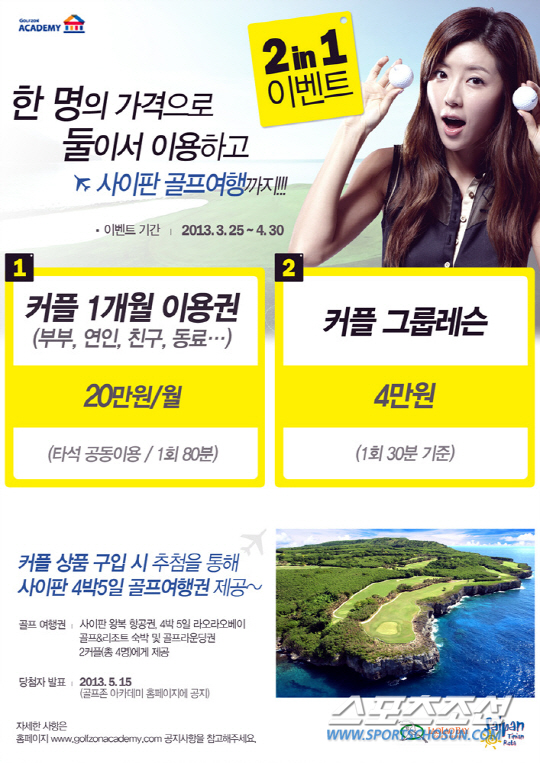 이벤트 상품은 오는 30일까지 경기 및 수도권의 골프존 아카데미 매장을 통해 등록할 수 있다. 등록한 커플 중 2커플은 추첨을 통해 사이판 4박5일 골프여행권을 제공한다. 아카데미 매장 위치 및 이벤트 관련 상세 사항은 골프존 아카데미 홈페이지(http://academy.golfzon.com)를 통해 확인해 볼 수 있다.