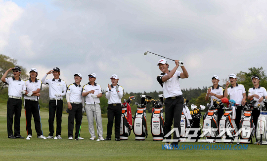 SK 텔레콤 소속인 홍순상이 연습라운드에서 동료들이 보는 가운데 샷을 날린뒤 환하게 웃고 있다. 사진제공=테일러메이드