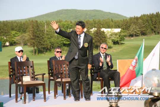 최경주가 21일 제주 서귀포 나인브릿지 골프장에서 열린 월드클럽챔피언십 개막식에 참석해 손을 들어 인사하고 있다. 사진제공=CJ