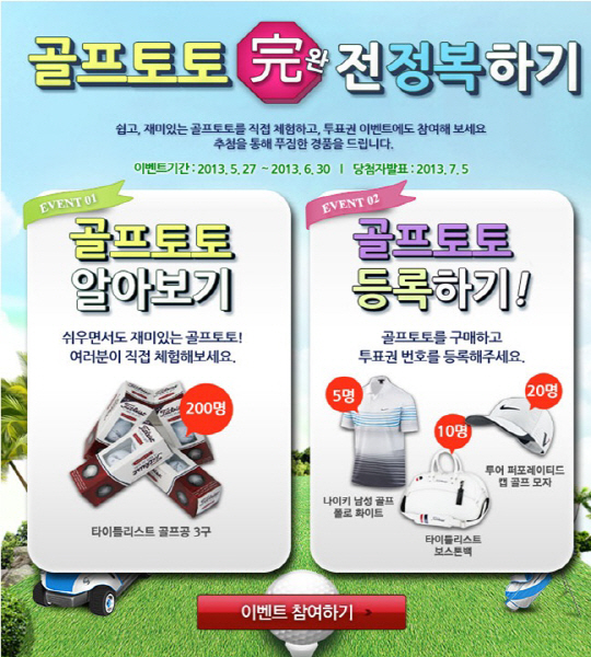 특히 첫 번째 이벤트인 '골프토토 알아보기' 의 경우 현재 발행되고 있는 골프토토 게임에 직접 참여만 하면 되기 때문에, 골프토토를 즐기는 팬들의 발걸음이 끊이지 않고 있다. 골프토토를 체험한 토토팬들에게는 추첨을 통해 타이틀리스트 골프공 3구를 총 200명에게 증정한다.