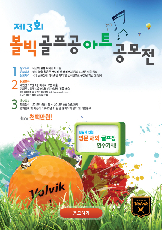 올해 3회째를 맞은 이번 공모전은 6월 1일 시작해 오는 9월 30일까지 개최되며 국내 골프장 종사자들을 대상으로 진행된다. '나만의 감성 디자인 아트볼'이 주제로 볼빅 볼을 활용한 캐릭터 및 캐리커쳐 등 디자인 작품을 모집한다. 국내 골프장에 재직 중인 캐디 및 임직원으로 구성된 개인 혹은 단체(4인 이내)로 접수가 가능하며 입상자 전원에게는 해외 명문 골프장 연수 기회가 주어진다. 골프공 8알로 구성된 작품이어야 하며 추후 당선작의 상품화를 위해 11도 이내의 색 표현만 가능하다. 네임팬 또는 매직펜을 사용해야 하며 인쇄물 부착물을 이용한 작품은 제외된다. 그림 이외 공예작품 역시 제외된다. 개인전과 단체전(4인 이내) 모두 1점 이내로 출품해야 한다. 총상금 규모는 1100만원이다. 자세한 사항은 볼빅 홈페이지 이벤트에서 확인이 가능하다. 문의는 02-424-5211