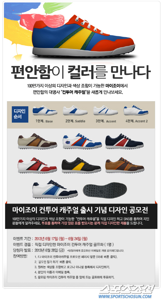 FJ가 커스텀 골프화 서비스인 '마이조이 (MyJoys)'에 스파이크리스 골프화 모델인 '컨투어 캐주얼' 옵션을 전세계 동시 런칭했다. 또 이를 기념해 오는 24일까지 전세계 7개국 (한국 미국, 캐나다, 영국, 프랑스, 독일, 스웨덴) 통합 온라인 이벤트를 진행한다. 마이조이는 골프화 사이즈와 넓이, 부분별 컬러와 이니셜/로고 등을 조합해 1가지 모델 안에서도 100만가지 이상의 다양한 스타일을 만들어 볼 수 있는 커스텀 골프화 서비스. 이번에 추가된 '컨투어 캐주얼'은 마이조이에서 처음 선보이는 스파이크리스 옵션으로, 골프화는 물론 일상화로도 연출이 가능하다. 한편, 온라인 이벤트는 마이조이 프로모션 페이지(www.myjoys.co.kr)에 접속해 나만의 '컨투어 캐주얼'을 디자인 해 응모하면 가장 많은 투표를 받은 나라별 1명에게 해당 제품을 증정한다. 당첨자는 28일 사이트에서 확인할 수 있다.