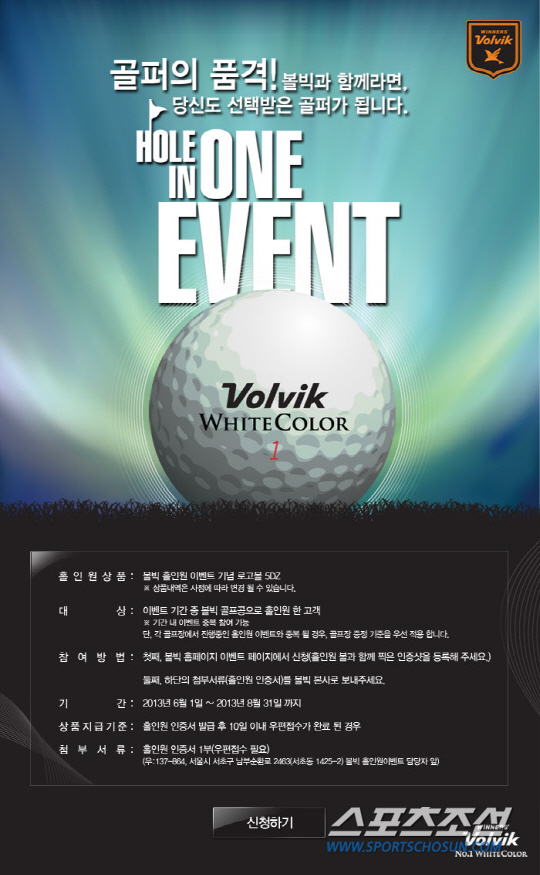 이번 이벤트는 볼빅 홈페이지에서 홀인원을 기록한 볼과 함께 찍은 '인증샷'과 신청서를 각각 작성한 후 해당 골프장에서 발행한 홀인원 인증서를 우편으로 접수하면 된다. 이벤트에 참여한 골퍼는 '홀인원 명예의 전당'에 오르고 홀인원 기념 로고볼 5더즌이 부상으로 증정된다.