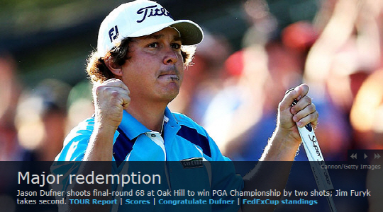 생애 첫 메이저대회 우승 목전까지 갔던 2011년 PGA 챔피언십에 이어 다시 맞이한 2013년 PGA 챔피언십, 더프너는 2년 전과 달리 여유가 있었다. 2라운드에서는 메이저대회 최소타 타이기록인 63타를 적어내며 우승에 대한 기대감을 높였다. 결국 더프너는 12일(한국시각) 미국 뉴욕주 로체스터의 오크힐 골프장 이스트코스(파70·7163야드)에서 열린 대회 최종라운드까지 최종합계 10언더파 270타를 기록하며 짐 퓨릭(미국)을 2타 차로 따 돌리고 정상에 섰다. 2년 전 아쉽게 놓쳤던 생애 첫 메이저대회 우승이다. 아내 어맨다와 포옹을 나눈 더프너는 브래들리와도 부둥켜 안으며 2년 전의 아쉬움마저 날려버렸다. 더프너도 이제 당당한 '메이저 챔프'로 이름을 남기게 됐다.