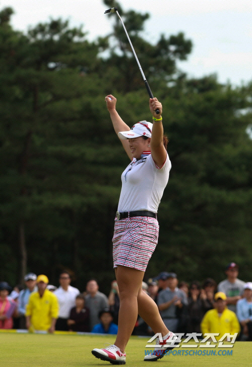 장하나가 마지막날 18번홀에서 우승을 결정지은 뒤 두팔을 번쩍 들고 기뻐하고 있다. 사진제공=KLPGA