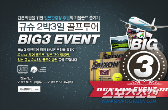 던롭스포츠코리아는 일본관광청 후원으로 일본 큐슈 골프투어 상품권 및 항공권을 제공하는 "던롭코리아와 일본관광청이 함께하는 Big3 이벤트"를 던롭코리아 홈페이지(http://www.dunlopkorea.co.kr)에서 진행한다.