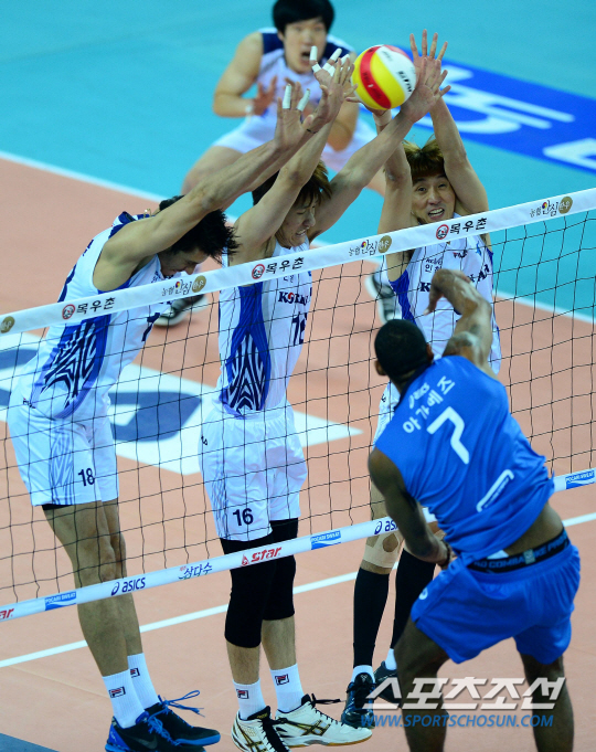 대한항공이 10일 인천 계양체육관에서 현대캐피탈을 상대로 경기를 펼쳤다. 대한항공은 새로운 홈 코트인 계양체육관에서 열리는 첫 홈 개막전이다. 현대캐피탈 아가메즈가 대한항공 블로킹을 앞에 두고 스파이크를 날리고 있다. 인천=송정헌 기자 songs@sportschosun.com/2013.11.10