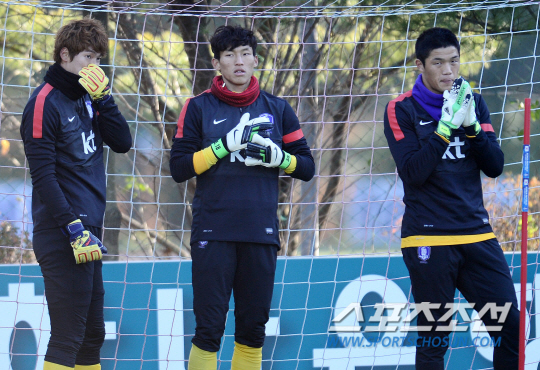 축구대표팀이 12일 오후 경기도 파주 축구트레이닝센터에서 소집 후 첫 훈련을 했다. 이범영 김승규 정성룡(왼쪽부터) 골키퍼가 함께 훈련을 하고 있다. 이날 소집된 홍명보호는 오는 15일 서울 상암에서 스위스와 평가전을 치른 후 19일 아랍에미리트 두바이에서 러시아와 원정 평가전을 치를 예정이다. 파주=정재근기자 cjg@sportschosun.com/2013.11.12/