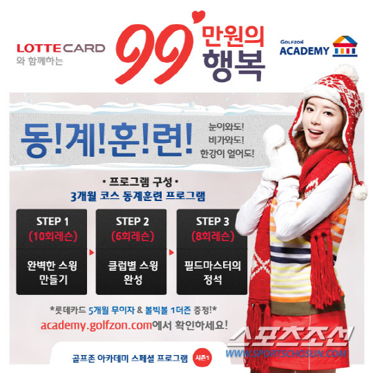 토털골프문화기업 골프존의 신개념 골프연습장 골프존 아카데미(http://academy.golfzon.com/)에서 추운 겨울에도 체계적으로 골프 연습을 할 수 있는 동계훈련 상품을 출시했다. 12월 31일까지 판매되는 이번 상품은 '롯데카드와 함께하는 99만원의 행복, 동계훈련'으로 겨울에도 실내의 쾌적한 환경에서 골프 실력을 향상시킬 수 있는 프로그램이다. 이번 프로그램은 3개월 동안 단계별로 총 24회의 레슨 및 연습으로 구성돼 있다. 상품 가격은 99만원이며 롯데카드로 결제할 경우 5개월까지 무이자 할부가 가능하며 선착순 200명에게는 볼빅볼 1더즌을 증정한다.