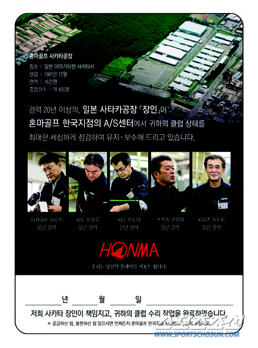 주식회사 혼마골프는 제품의 보다 나은 품질 보증을 위해 내년부터 사후관리(AS) 실명제를 도입한다. 혼마골프는 한국지점에 AS센터를 설립한 뒤 약 3년간 사카타 공장 장인이 한 달에 두 명씩 한국에 상주하며 AS를 해오고 있었다. 이는 '클럽의 AS는 클럽을 제작한 사람이 직접해야 한다'라는 혼마 사카타 공장의 기본 방침에 따른 것이다. 실명제는 보다 명확한 제품의 품질 보증을 위해 다음 달부터 클럽 AS 완료 시 담당 장인의 시그니처가 들어간 'AS 완료증'을 클럽과 함께 발송하는 것을 말한다. 혼마클럽 고객은 모두 서비스를 받을 수 있다.