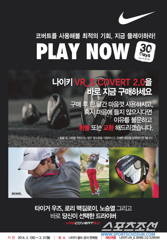 나이키 골프가 VR_S 코버트 2.0 클럽 출시를 기념해 3월 한달간 신제품 특별 체험 혜택을 제공하는 'PLAY NOW'프로모션을 실시한다. 이번 프로모션은 일반 소비자들이 타이거 우즈, 로리 맥길로이, 노승열 등 세계적인 선수들이 투어 대회에서 사용하는 VR_S 코버트 2.0 드라이버를 30일간 마음껏 사용해 본 후 최종 구매를 결정할 수 있는 기회를 제공하고자 마련했다. 오는 31일까지 전국 나이키골프 공식판매점에서 VR_S 코버트 2.0 드라이버를 구매한 고객을 대상으로 실시하며, 구입 후 30일 이내에 품질에 만족하지 않으면 사용 여부에 상관없이 무조건 교환 또는 100% 전액 환불이 가능하다. 교환 및 환불을 원하는 고객은 영수증을 지참하고 구입 매장을 방문하면 된다.