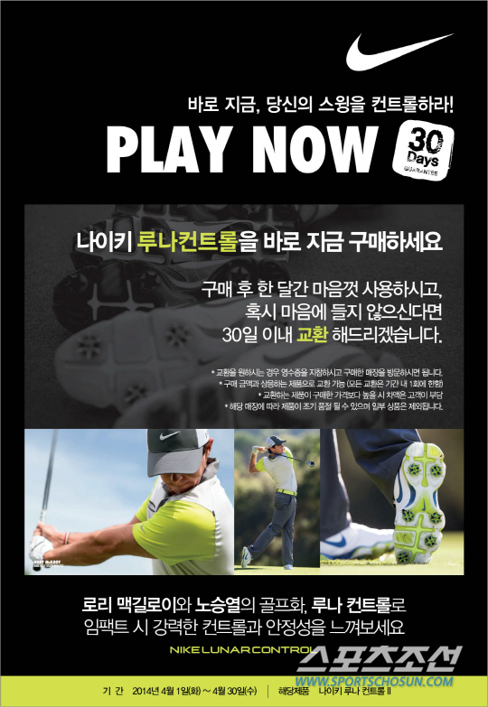 나이키 골프가 4월 한달 동안 기능성 골프화 루나 컨트롤 II를 30일간 체험할 수 있는 'PLAY NOW: 루나 컨트롤' 프로모션을 실시한다. 이번 프로모션은 나이키 골프에서 두 번째로 준비한 'PLAY NOW' 프로모션으로 지난 3월 실시한 'VR_S 코버트 2.0 드라이버' 1개월 체험 이벤트 'PLAY NOW' 프로모션의 뜨거운 성원에 힘입어 마련한 체험 이벤트다. 30일까지 전국 나이키 골프 공식판매점에서 기능성 골프화 '루나 컨트롤 II'를 구입한 고객을 대상으로 하며 구입 후 30일 이내에 품질에 만족하지 않으면 사용 여부에 관계없이 다른 제품으로 교환할 수 있다. 교환을 원하는 고객은 영수증과 구매 박스를 지참하고 구입 매장을 방문하면 된다. 제품 교환 시 차액 환불은 불가능하며 추가 금액은 현장에서 결제할 수 있다.