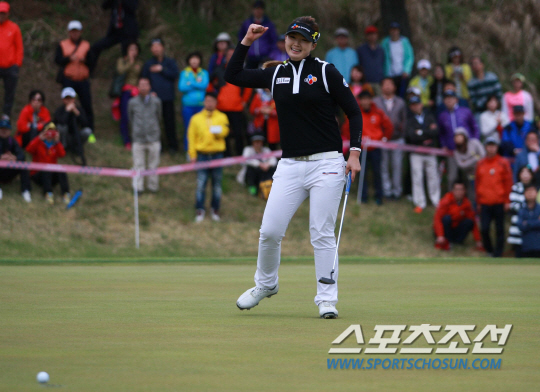 백규정이 18번홀에서 버디퍼트를 성공시키면서 우승을 확정짓자 오른손을 불끈 쥐며 기뻐하고 있다. 사진 제공=KLPGA