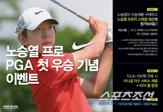 나이키골프가 후원 선수인 노승열의 PGA 투어 첫 챔프 등극을 기념해 5월 한 달간 전국 나이키 골프 공식판매점에서 '노승열 프로 PGA 첫 우승 기념 이벤트'를 실시한다. 이번 이벤트는 노승열이 PGA 투어 취리히 클래식 우승 시 사용한 'RZN 플래티넘' 볼과 'VR_S 코버트 2.0 투어 드라이버' 등 최상의 퍼포먼스를 구현하는 나이키 골프 제품을 만나볼 수 있도록 마련한 프로모션이다. 오는 31일까지 프로모션 기간 동안 'VR_S 코버트 2.0 드라이버'나 기능성 골프화 '루나 컨트롤 II'를 구매하는 고객들에게 스크레치 카드를 증정한다. 카드 응모를 통해 100% 당첨 확률로 RZN 볼을 증정하며, 이중 100명을 노승열의 '스페셜 레슨'에 특별 초청한다. 또한, '노승열 카트백'이라 불리는 '나이키 VRS II 스탭백'을 구매하는 고객에게는 자수 이름 프린트 서비스와 RZN 볼을 증정한다.