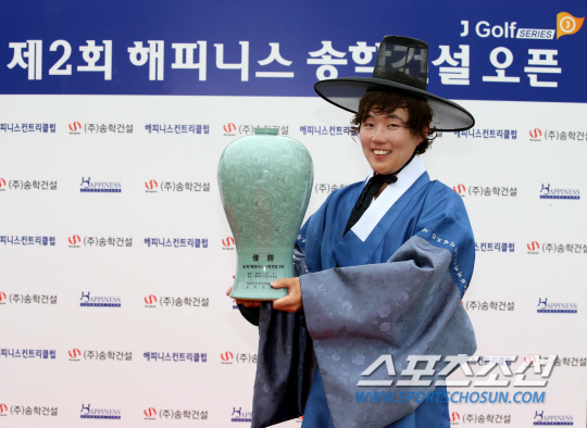 허윤경이 시즌 첫승을 거둔 KLPGA 투어 E1채리티 우승 트로피를 들고 환하게 웃고 있다. 사진제공=KLPGA